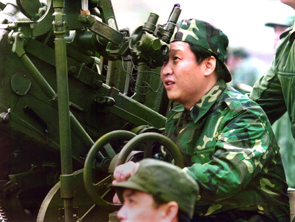 1997年11月,時任福建省委副書記、福建陸軍準備役高炮師第一政委習近平體驗某型高炮炮手練習。